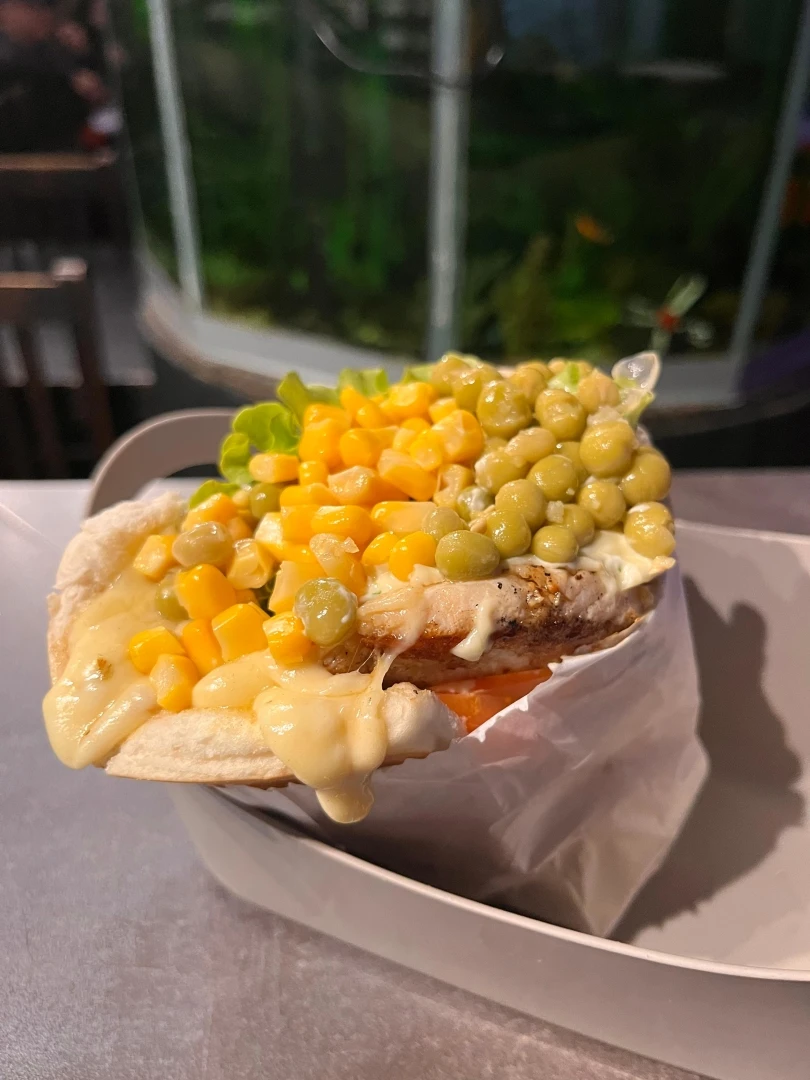 Pão, Camarão, Queijo, Maionese Caseira, Tomate, Alface, Milho e Ervilha.