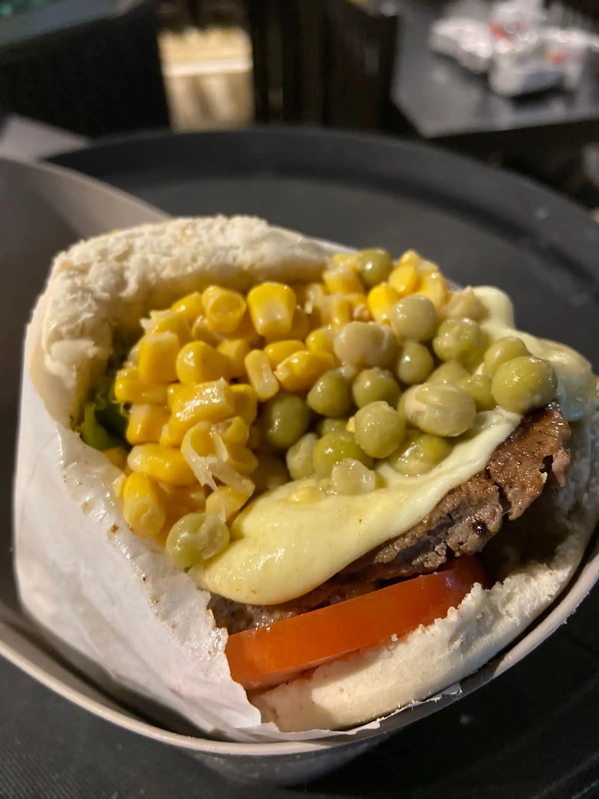 Pão, Filé Picado Acebolado, Queijo, Maionese Caseira, Tomate, Alface, Milho e Ervilha.