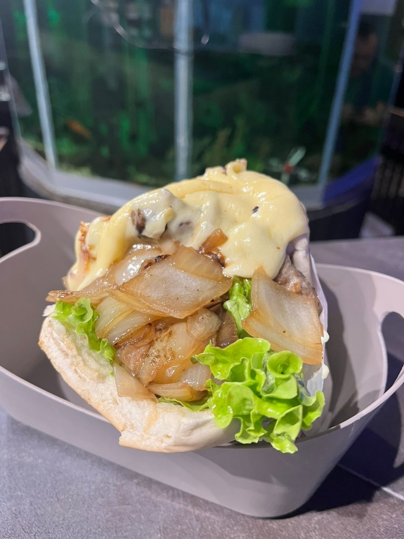 Pão, Hambúrguer de Costela, Frango, Queijo Duplo, Batata-Frita, Cebola Roxa, Bacon e Maionese Caseira.