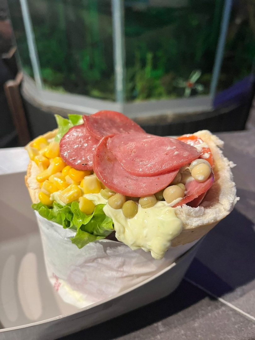 Pão, Camarão, Queijo, Maionese Caseira, Tomate, Alface, Milho e Ervilha.
