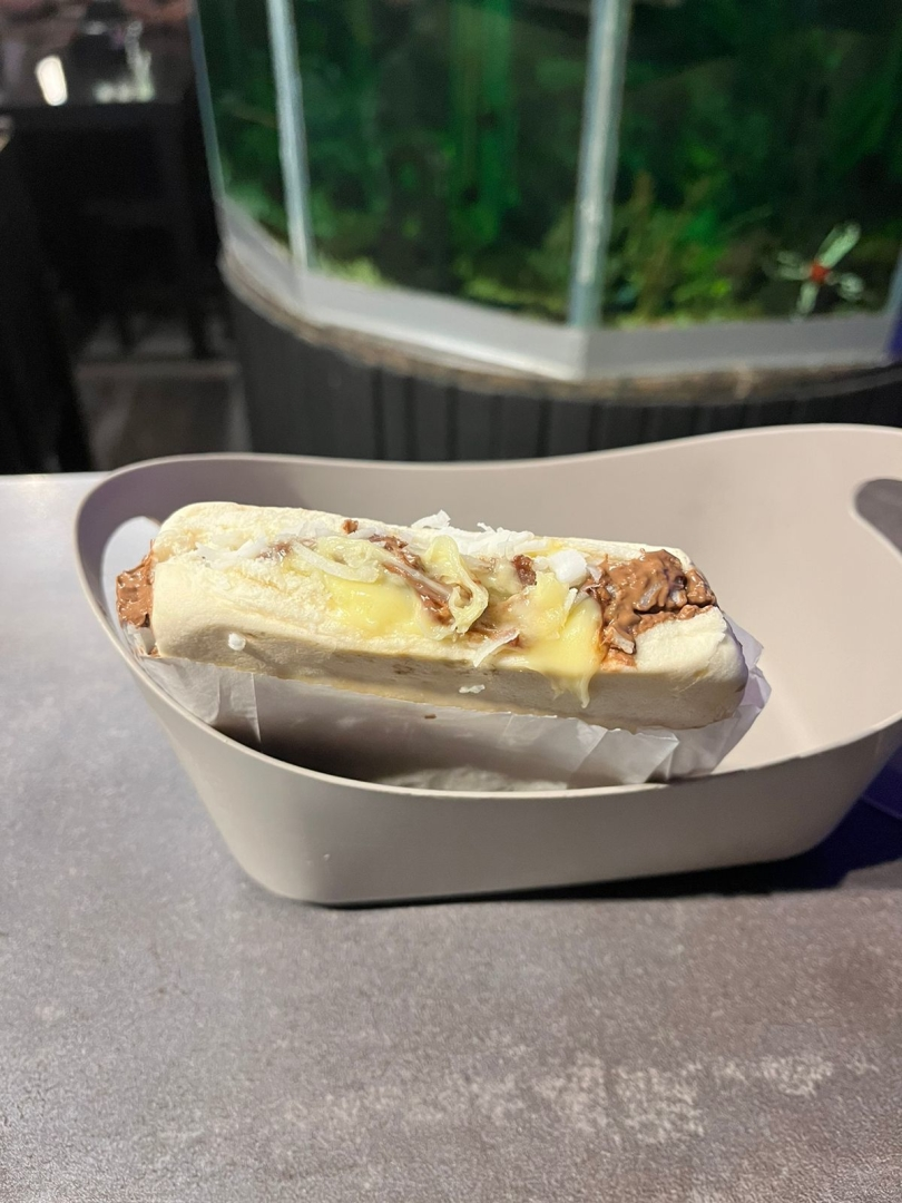 Pão, Chocolate Preto com Coco, Leite Condensado e Queijo.